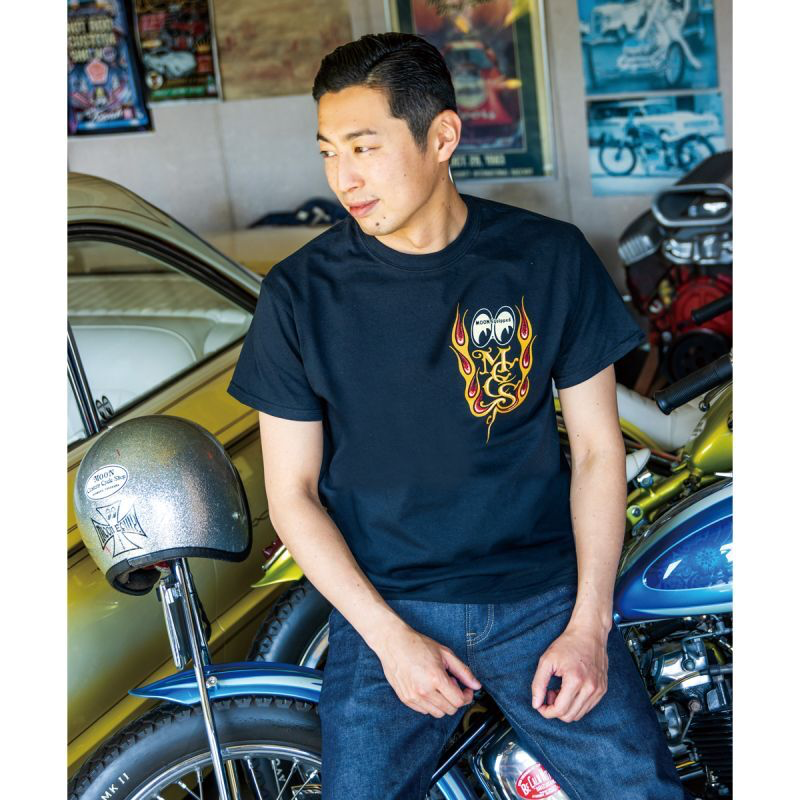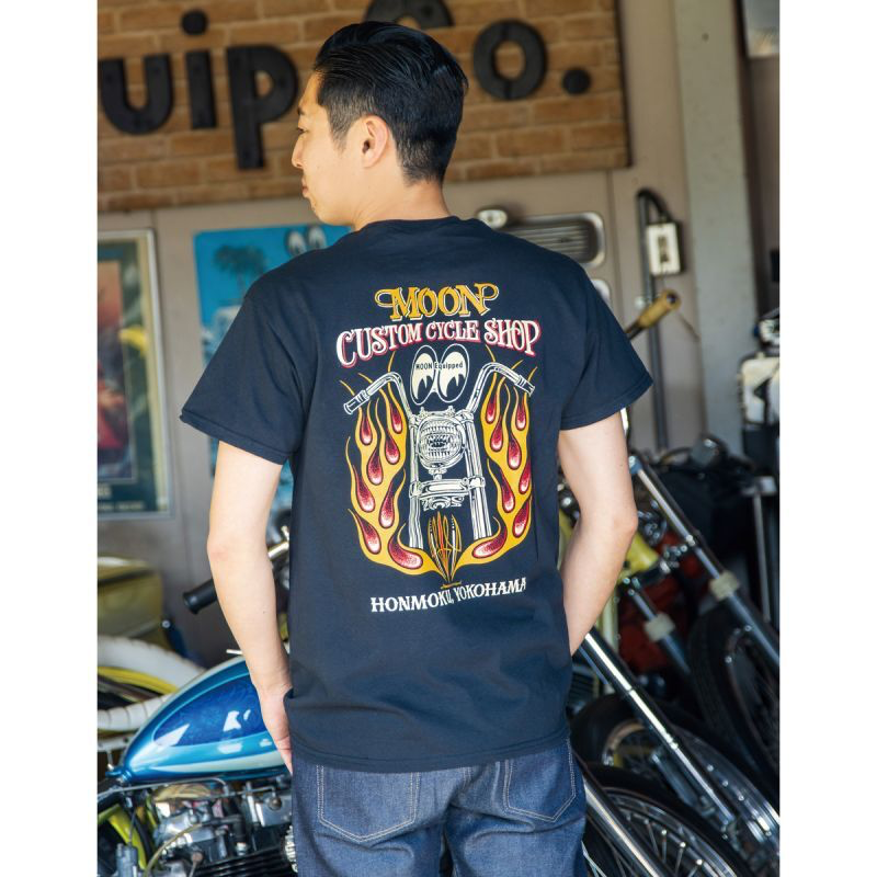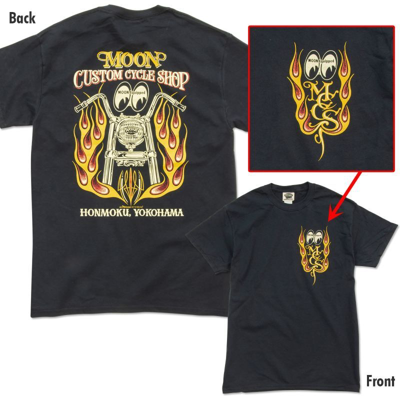 Wildman Ishii designed MOON Custom Cycle Shop (MCCS) brand t-shirt featuring the front shot of a motorcycle from a low angle, decorated with flames pinstripe.