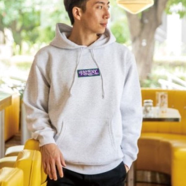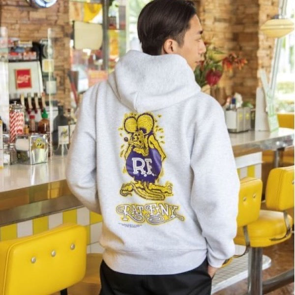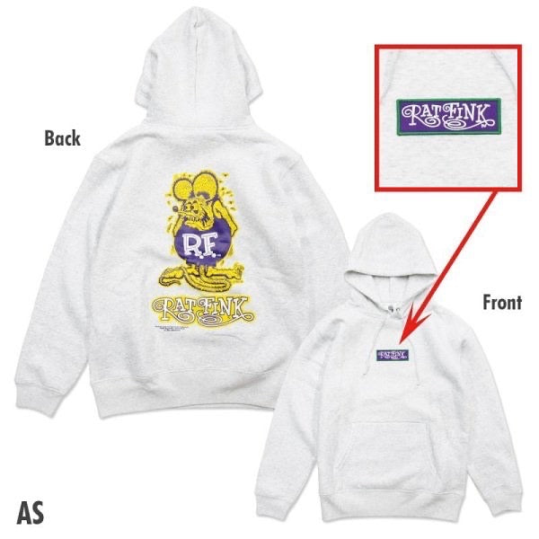 A Pullover Hoodie featuring, a curly font Rat Fink logo patch is accented on the front, and Standing Rat Fink is printed on the back.