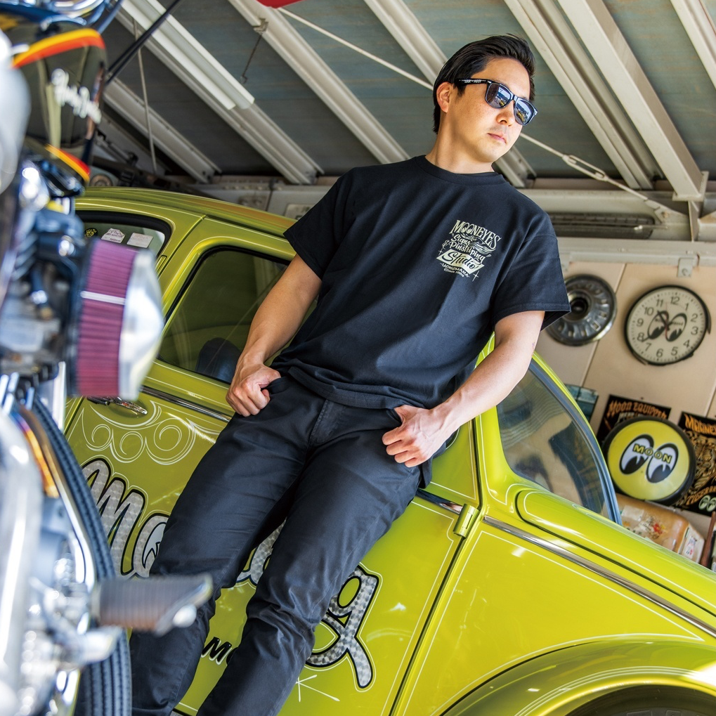 Noto agli addetti ai lavori, il design mette in risalto l'iconico personaggio di Mr Wildman, insieme a Deuce e Harley raffigurati in delicate righe. Nel 1989, prima che il termine "custom" si diffondesse ampiamente in Giappone, MOONEYES S&P Studio ha aperto i battenti a Goshoyama, a Yokohama. Il design sorprendente, simbolo dello studio, decora il retro!